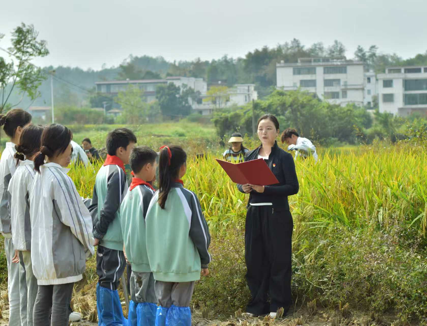 在新圩村的稻田边,金黄的稻穗随风摇曳,丰收的喜悦扑面而来。杨宏瑜化身“思政教师”,以“丰收里的家国情怀”为主题,为师生们讲授了“田梗上的思政课”。课上,她结合新圩村近年来在党的乡村振兴政策支持下发生的巨大变化,从水稻种植的历史文化讲到粮食安全的重要意义,从农民辛勤劳作的场景讲到劳动精神的时代价值。“每一粒粮食都来之不易,每一次丰收都凝聚着汗水与智慧,”她勉励同学们,要珍惜粮食、热爱劳动,从小树立“强国有我”的远大志向,将来用知识和本领为乡村振兴、为国家发展贡献力量。