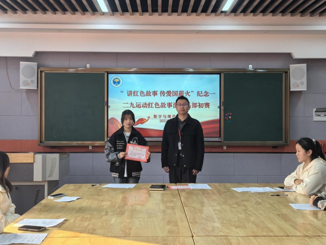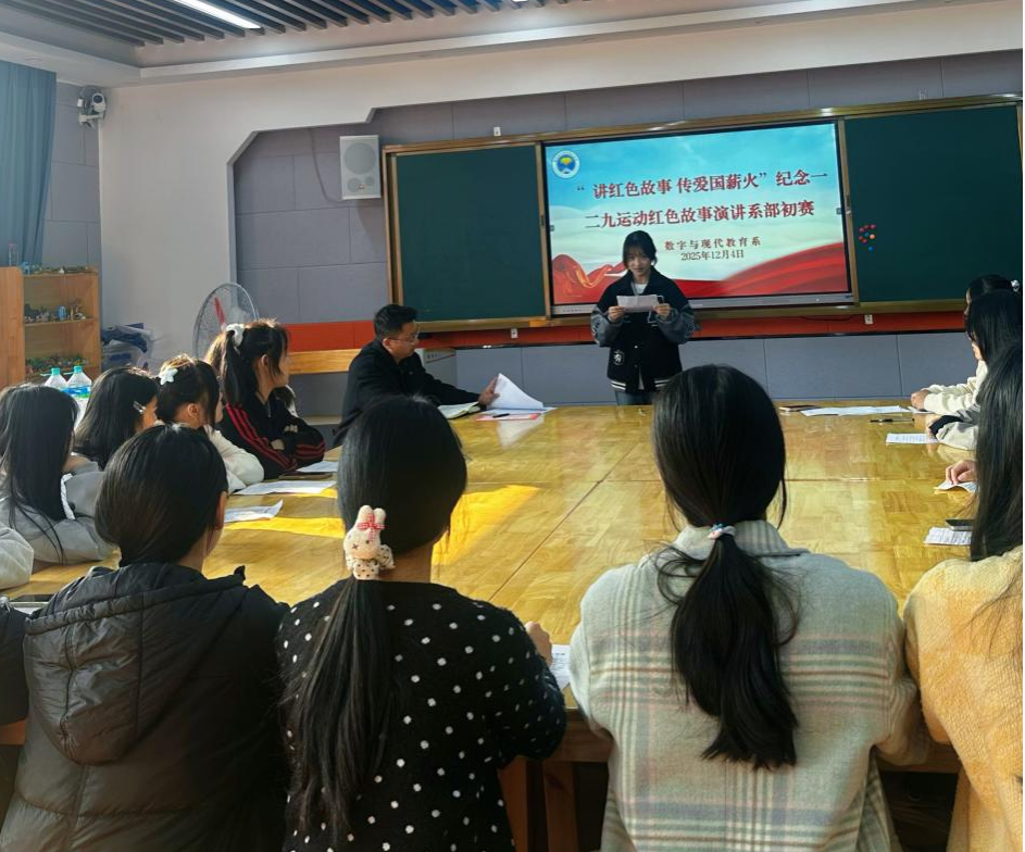 (通讯员:曾小英)为铭记一二·九运动光辉历史,弘扬爱国主义精神,12月4日,数字与现代教育系“传承一二·九精神,赓续红色血脉”红色故事演讲比赛初赛在科技楼幼儿保育室如期举行。系主任吴祖尧、学工干事曾凯赞担任评委,部分师生代表到场观赛,共同聆听红色故事,感悟初心使命。