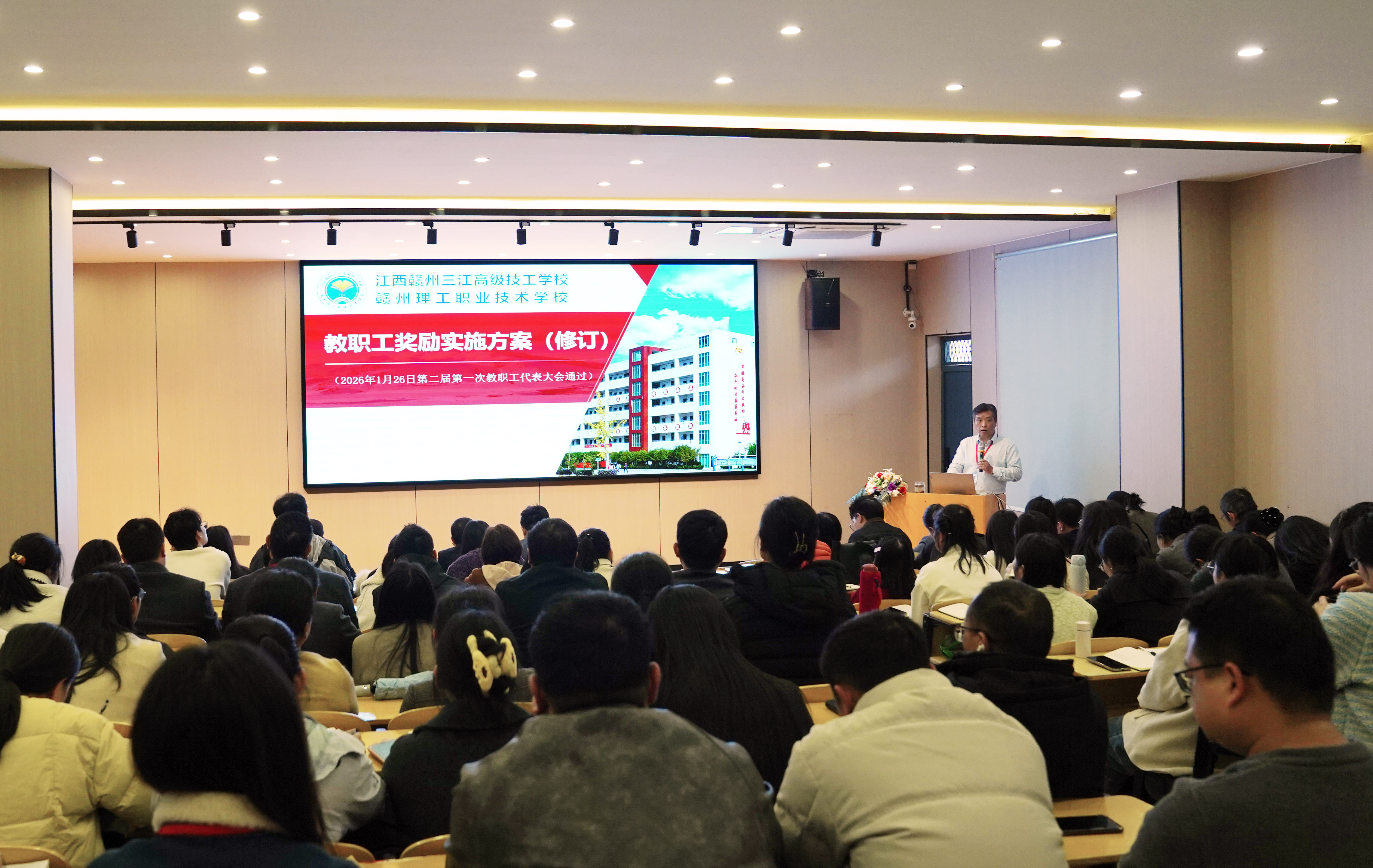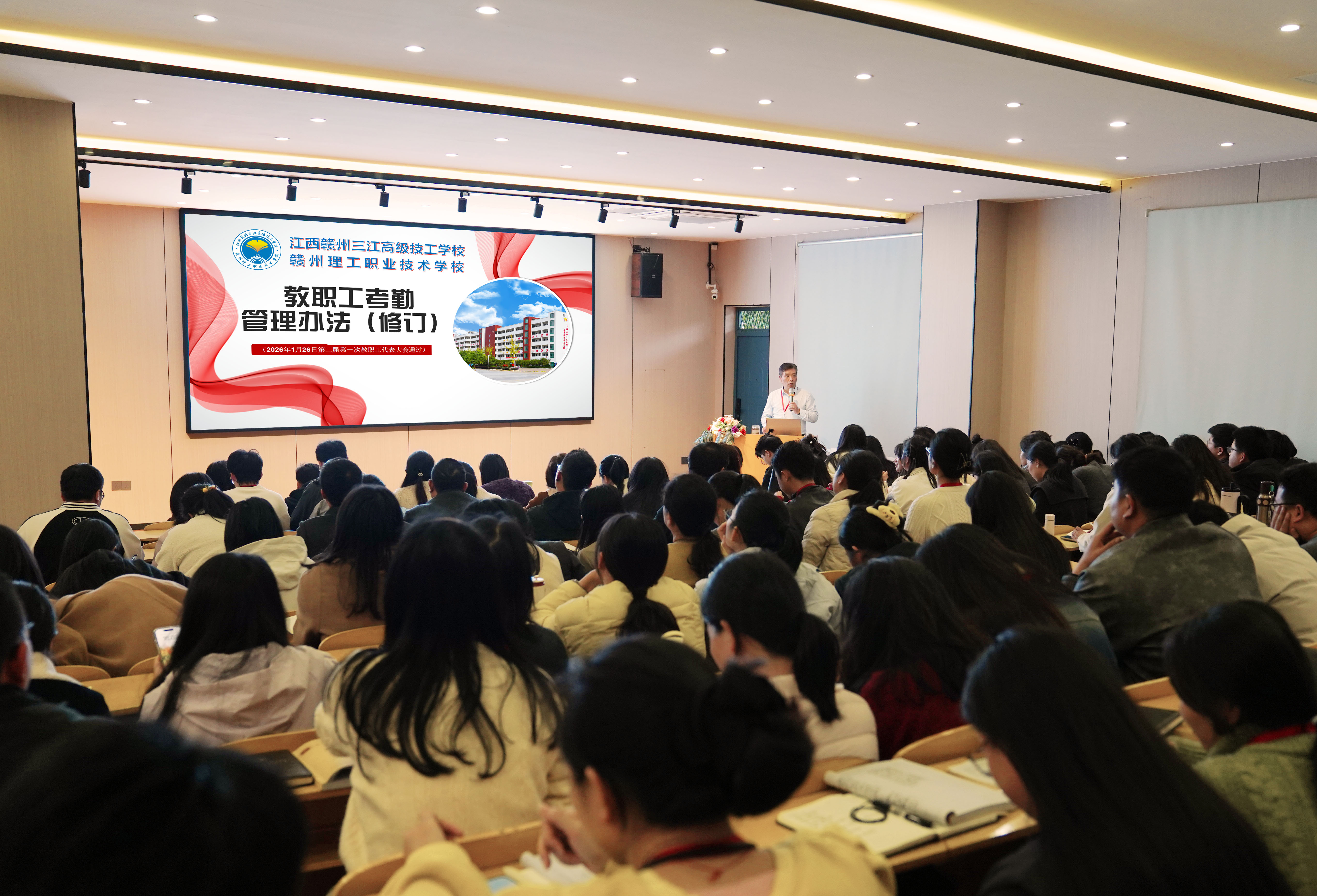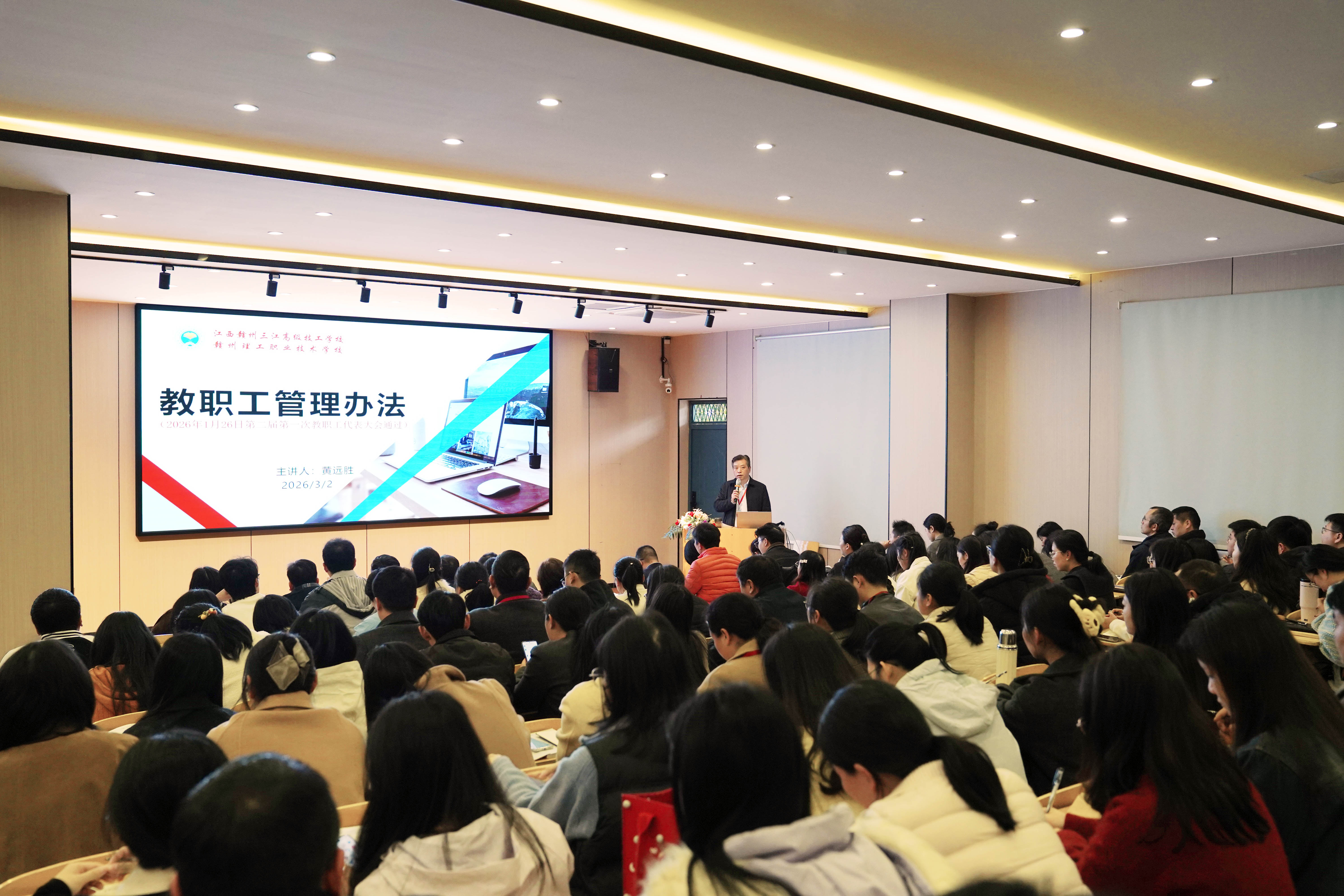 为健全学校管理制度体系,规范办学治校行为,提升教职工综合素养与安全防范能力,3月2日下午,我校全体教职工齐聚学术报告厅,召开2026年第一次教职工大会。会议由校长黄远胜主持,校领导、中层干部及全体教职工参加会议。
