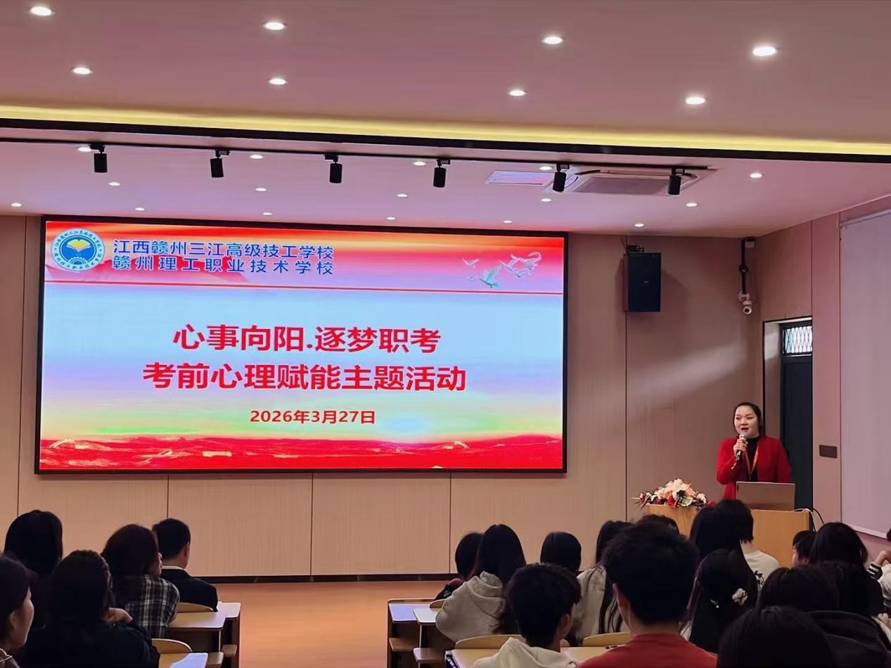 为帮助2026年高考(单招、统招)学子缓解备考压力、调适心理状态,以积极从容的心态迎战职业高考与单招考试,3月27日,我校学术报告厅隆重举行“心事向阳·逐梦职考”考前心理赋能主题活动。学校副校长林玲出席活动并发表讲话、专职心理咨询师李友香主讲,200余名高考学子共同参与本次活动,学工处主任钟庚宏主持。