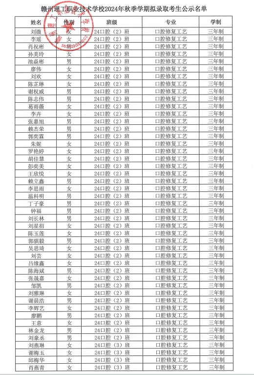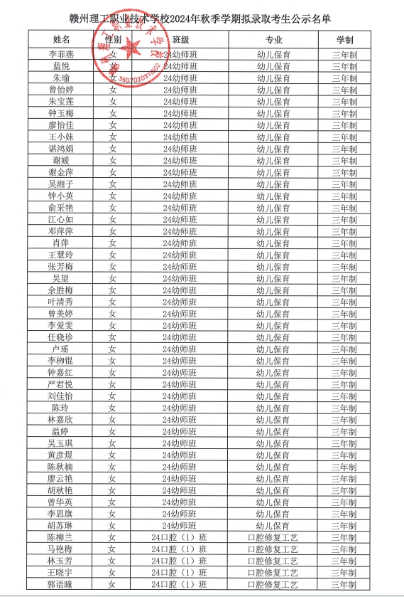 赣州理工职业技术学校2024年秋季学期拟录取考生公示名单