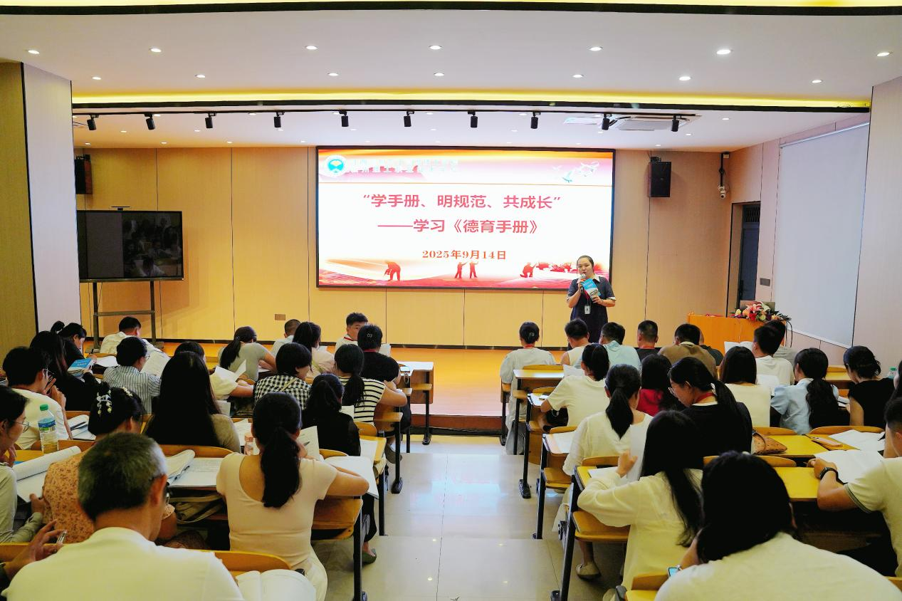 为进一步加强校园德育工作,规范学生日常行为,引导学生养成良好习惯,近日,我校组织开展了以2025级新生“学手册、明规范、共成长”为主题的《德育手册》系列学习活动,副校长林玲主持召开了学习动员大会。