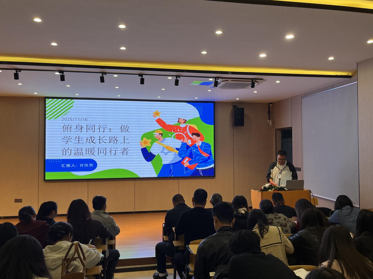 讲座中,曾凯赞老师重点强调“平等互动”的教育理念,现场展示了他与学生共同创作的短视频作品——镜头下,师生一同记录校园日常、分享生活趣事,用年轻化的方式搭建起沟通桥梁。“教育不是单向的灌输,而是双向地陪伴与成长。”曾老师谈到,他始终坚持深入学生群体,主动与学生聊日常琐事、谈兴趣爱好,在轻松的交流中敏锐发现学生的困惑与需求,以“引路灯”的姿态给予恰到好处的引导与支持。