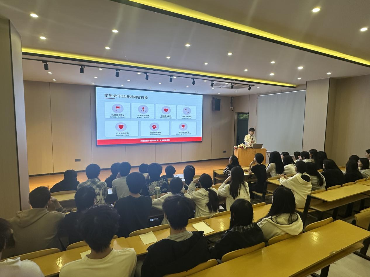 为强化学生会干部队伍建设,提升干部综合素质与服务能力,打造一支“强素质、树形象、勇担当、优服务”的卓越学生团队,4月8日下午,我校在学术报告厅开展2026年度学生会干部专题培训。培训由学生会指导老师邱昌龙主持,特邀学工处主任钟庚宏担任主讲人,全体学生会干部全程参与培训。